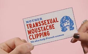 The video features a shot of their new "shop" with a huge banner saying "transsexual mustache clipping" (which is represented by images of men with mustaches wearing wigs). Just to add a double dose of outrageousness, the wags at Mother, NY also include a line saying, "We also help French women." In case you don't understand the humor in this line, just follow me: 1) the women in some ethnic groups have more facial hair than others; 2) facial hair on women is just gross; 3) all Americans hate the French; 4) C'mon, it's just funny, lighten up! *raucous laughter*